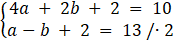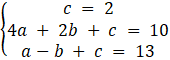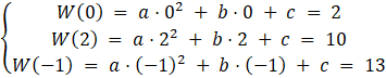 Wiedząc, że wielomian dla x = 0 przyjmuje wartość 2, dla x = 2 wartość 10 a dla x = -1 wartość 13. Wykonaj podstawienie: