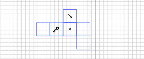 Litera M sąsiaduje z kluczem i strzałką, gdzie klucz jest przy lewym, pionowym boku tej litery. Strzałka wskazuje na górę litery M. Przeanalizuj siatki pod tym kątem i dorysuj brakujące figury.