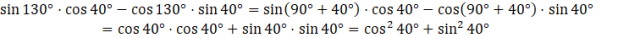 Mając liczbę sin 130° ⋅ cos 40° - cos 130° ⋅ sin 40°, oblicz ją.