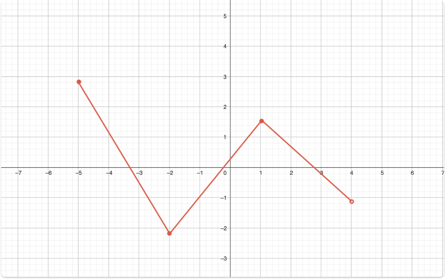 W tym zadaniu musisz narysować taką funkcje f, aby dziedziną był zbiór <-5,4) oraz funkcja ma być malejąca w przedziałach <-5; -2>, <1,4) oraz ma być rosnąca w przedziale <-2;1>.
