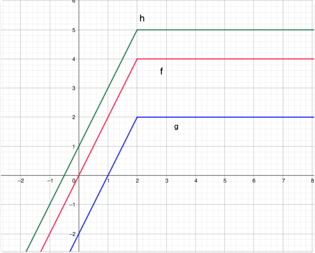 Zauważ, że wykres funkcji g powstał poprzez przesunięcie wykresu funkcji f o 2 jednostki w dół oraz wykres funkcji h powstał poprzez przesunięcie wykresu funkcji f o 1 jednostkę w górę. Zatem: