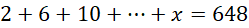Zapisz pierwszy wyraz ciągu i jego różnicę. Wyznacz liczbę wyrazów tego ciągu, korzystając z wyrazu ogólnego ciągu. Teraz oblicz x ze wzoru na sumę n wyrazów ciągu arytmetycznego.