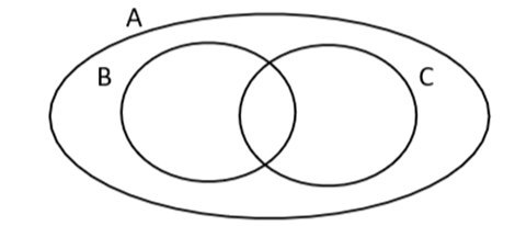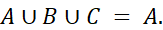 Suma zbiorów A, B, C ma dać zbiór A. Sugeruje to na, że zbiór A musi być największy z tych trzech zbiorów oraz ze zbiory B i C muszą zawierać się w zbiorze A. Umiejscowienie tych zbiorów w zbiorze A jest dowolne.