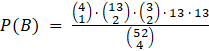 Zdarzeniami elementarnymi sprzyjającymi zdarzeniu B są: wylosowanie jeden kolor i dwie karty w tym kolorze, następnie dwa spośród 3 pozostałych kolorów, a w nich po 13 kart. Prawdopodobieństwo możesz zapisać jako