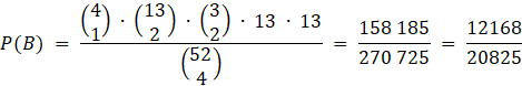 W tym zadaniu musisz obliczyć prawdopodobieństwo zdarzenia B – wśród kart, które wylosowano, znajduje się dwie karty w jednym kolorze i dwie w różnych kolorach, jeśli losujemy 4 karty z talii 52.