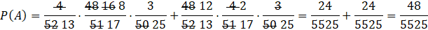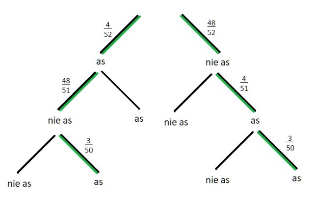 A – po trzech losowaniach wyciągnięto 3 asy (przy czym drugi został wyciągnięty w trzecim losowaniu)