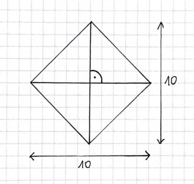 Przekątne kwadratu, tak jak rombu, przecinają się w połowie pod kątem prostym.