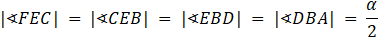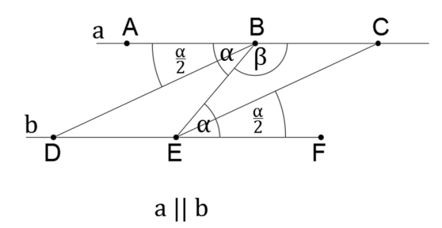 Wynika z tego, że proste EC i DB tworzą kąty naprzemianległe. Wykorzystując twierdzenie odwrotne do twierdzenia o dwóch prostych równoległych przeciętych trzecią prostą, można stwierdzić, że proste EC i DB są równoległe.