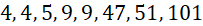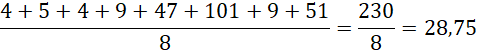 Wyznacz medianę, dominantę i średnią arytmetyczną zestawu liczb 4, 5, 4, 9, 47, 101, 9, 51.