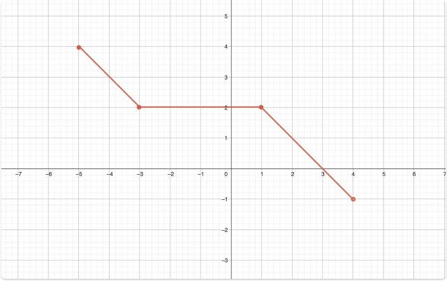 Narysuj taką funkcję w przedziale <-5,4), aby funkcja była malejąca w przedziałach <-5,-3>, <1,4). Ponadto funkcja ma być stała w przedziale <-3,1>.