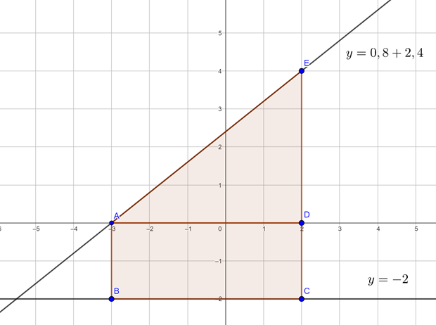 Obliczmy pole zacieniowanej figury, licząc osobno pole trójkąta, który jest częścią tej figury, oraz pole prostokąta, który też jest częścią tej figury. Aby obliczyć pole trójkąta musimy znaleźć współrzędne punktów A i E. Punkt A jest miejscem zerowym funkcji liniowej