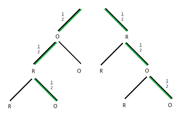 Zakończenie rzucania po trzecim rzucie odpowiada wyrzuceniu drugiego orła w trzecim rzucie. Masz tu do czynienia z doświadczeniem losowym wieloetapowym, więc narysuj drzewko. Każdy poziom drzewka będzie odpowiadał kolejnemu rzutowi. Oczywiście nie ma sensu rysować całego drzewka, gdyż interesują cię jedynie pierwsze trzy rzuty. Zauważ, że nie musisz rysować wszystkich możliwych wyników trzech rzutów. Wyrzucenie drugiego orła już w drugim rzucie powoduje, że rzucanie kończy się po dwóch rzutach, co nie jest zdarzeniem losowym. Także w sytuacji, gdy pierwsze dwa rzuty dały reszkę nie jest możliwe spełnienie warunku końca gry w trzecim rzucie. Prawdopodobieństwo wyrzucenia zarówno orła jak i reszki wynosi zawsze jedna druga. Gdy już narysujesz drzewo zaznacz te zdarzenia, których prawdopodobieństwo będziesz liczył oraz wszystkie gałęzie po drodze. Następnie przemnóż przez siebie prawdopodobieństwa na poszczególnych gałęziach oraz dodaj do siebie uzyskane wyniki z różnych gałęzi.
