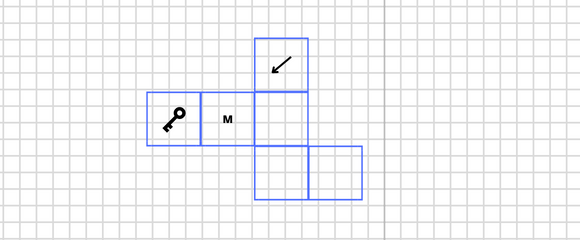 Litera M sąsiaduje z kluczem i strzałką, gdzie klucz jest przy lewym, pionowym boku tej litery. Strzałka wskazuje na górę litery M. Przeanalizuj siatki pod tym kątem i dorysuj brakujące figury.