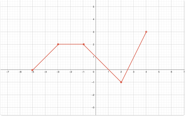 Narysuj taką funkcję w przedziale <-5,4), aby funkcja była malejąca w przedziale <-1,2> , rosnąca w przedziałach <-5,-3>, <2,4). Ponadto funkcja ma być stałą w przedziale <-3,-1>.
