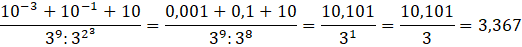 To zadanie musisz zacząć od zapisanie potęg w liczniku jako ułamki dziesiętne. W mianowniku musisz skorzystać z praw działań na potęgach: