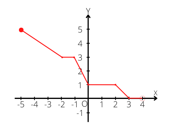 W tym zadaniu musisz narysować dowolną funkcję, której dziedzina to D = ⟨-5; 4), a jej wartości zmniejszają się w przedziałach 〈-5; -2〉, 〈-1; 0〉 i 〈2; 3〉 oraz pozostają takie same w przedziałach 〈-2; -1〉,〈0; 2〉 i ⟨3; 4).