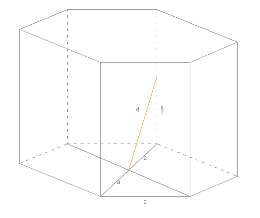 Znajdź odległość między punktem przecięcia się dłuższych przekątnych podstawy od połowy jego krawędzi bocznej graniastosłupa sześciokątnego prawidłowego, którego ściany boczne to prostokąty o wymiarach 4 × 6.