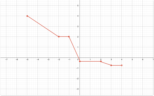 Narysuj taką funkcję w przedziale <-5,4), aby funkcja była malejąca w przedziałach <-5,-2>, <-1,0>, <2,3>. Ponadto funkcja ma być stała w przedziałach <-2,-1>, <3,4).