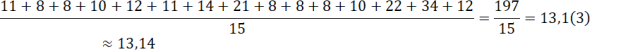 Wyznacz medianę, dominantę i średnią arytmetyczną zestawu liczb 11, 8, 8, 10, 12, 11, 14, 21, 8, 8, 8, 10, 22, 34, 12.
