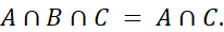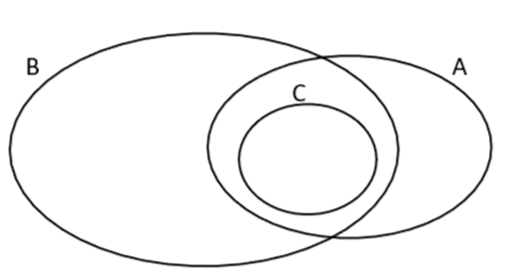 Przecięcie trzech zbiorów jest równe przecięciu zbiorów A i C. To oznacza, że przecięcie znajduje się w najmniejszym ze zbiorów, czyli zbiorze C. Następnie wiemy, że wszystkie zbiory mają cześć wspólną, zatem należy przeciąć ze sobą zbiory A i B, a następnie umieścić w tym przecięciu zbiór C.