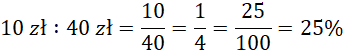 10 zł z 40 zł to jedna czwarta całości, czyli dwadzieścia pięć setnych, co daje 25%, a nie 20% kieszonkowego.