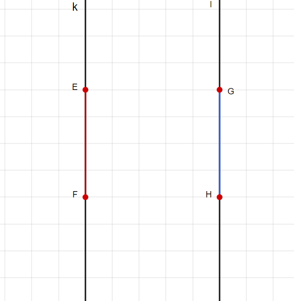 Musisz narysować odcinki EF i GH na prostych równoległych k i l, a następnie stwierdzić, jak te odcinki są względem siebie położone.