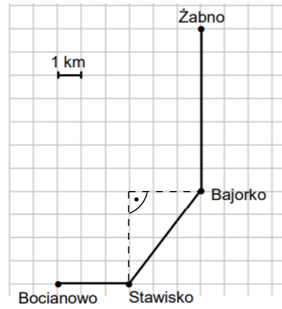 Zauważ, że pomiędzy Stawiskiem, a Bajorkiem nie da się odczytać odległości z rysunku. Skorzystaj z twierdzenia Pitagorasa w narysowanym trójkącie, aby obliczyć tą odległość.