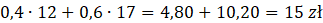 Oblicz cenę za kilogram mieszanki składający się z 40 dag rodzynek w cenie 12 zł za kilogram oraz 60 dag pestek dyni w cenie 17 zł za kilogram.