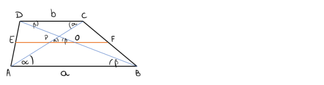 Zauważ trójkąty podobne i na tej podstawie udowodnij, że odcinek łączący środki przekątnych trapezu jest równy połowie różnicy jest podstaw.