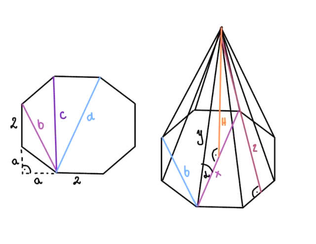 Oblicz miarę zaznaczonego kąta oraz długości zaznaczonych odcinków ostrosłupa prawidłowego ośmiokątnego.