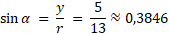 Punkt o współrzędnych (12, 5) należy do ramienia końcowego ostrego kąta α. Na podstawie warunku
