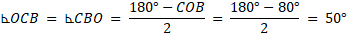 . Kąt COB to kąt środkowy, a kąt CAB to kąt wpisany i są one opisane na tym samym łuku CB, więc kąt COB jest dwa razy większy od kąta CAB. Trójkąt COB jest równoramienny, więc kąty przy jego podstawie są równe. Kąt OCP jest kątem prostym, bo prosta, na której się znajduje jest styczną do okręgu. Suma kątów OCB i BCP to