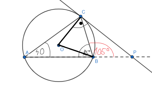 Na trójkącie ABC, gdzie miara kąta ⊾ABC wynosi 75°, a miara kąta ⊾CAB wynosi 40°, opisano okrąg. Styczna do okręgu, poprowadzona przez punkt C, przecina przedłużenie boku AB w punkcie P. Oblicz miary kątów trójkąta BPC.