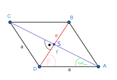 . Przyrównaj do siebie tw. wartości, skorzystaj z jedynki trygonometrycznej i oblicz długość a. Następnie oblicz długości e i f i oblicz pole rombu ze wzoru
