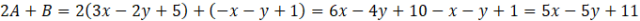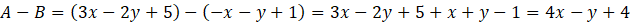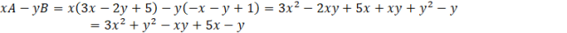 Podano dwa wyrażenia: A = 3x – 2y + 5 i B = -x – y + 1. Należy w jak najprostszej postaci zapisać wyrażenia: A – B, 2A + B oraz xA – yB.
