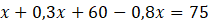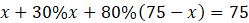 Niech x to pierwsza liczba, a 75 – x to druga liczba. 1,3x i 0,8(75 – x) dalej będą równały się 75. Rozwiąż równanie. Znajdź x i wskaż te dwie liczby.