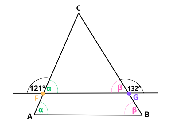 Trójkąt ABC został przecięty przez prostą m równoległą do boku AB. Oblicz miary kątów α i β w trójkącie ABC na podstawie informacji przedstawionych na rysunku.