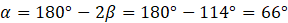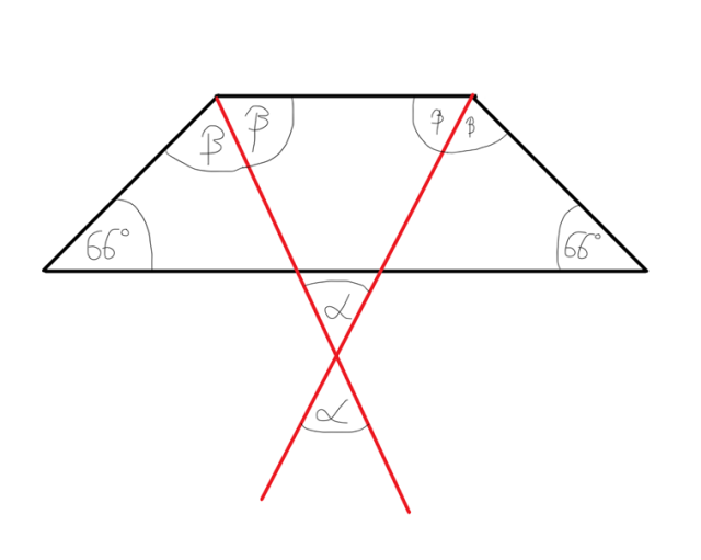 Trapez ABCD przedstawiony na rysunku jest równoramienny, a półproste CP i DP są dwusiecznymi jego kątów rozwartych. Kąty ostre trapezu mają po 66°. Oblicz miarę kąta ostrego α między dwusiecznymi.