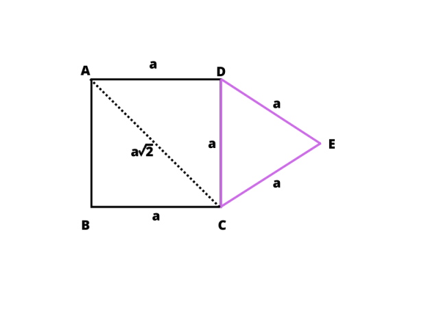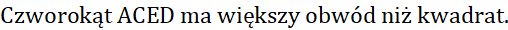 Porównaj obwody kwadratu i czworokąta ACED, jeśli wiadomo, że trójkąt równoboczny zbudowano na boku DC kwadratu i jego punkt E leży na zewnątrz kwadratu |DC| = a. Podaj różnicę.
