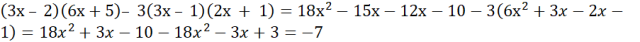 Wartość wyrażenia (3x – 2)(6x+5) – 3(3x – 1)(2x + 1)= -7, to oznacza, że dla dowolnego x wartość jest równa -7.