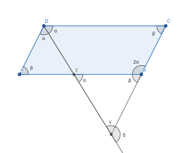 W równoległoboku ABCD, dwusieczna DE kąta rozwartego ADC oraz prosta BC tworzą dwa kąty przyległe, których miary są w stosunku 2:3. Wyznacz miary kątów równoległoboku.