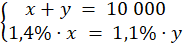 Zbuduj układ równań. Pierwsze równanie: suma wpłacona do obu banków jest równa 10 000 zł. Drugie równanie: odsetki w obu bankach były takie same, czyli kwoty wpłacone razy oprocentowanie były sobie równe. Z pierwszego równania wyznacz x, wstaw do drugiego i wylicz y, a następnie x.