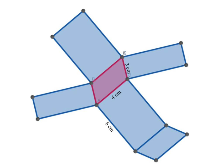 Krawędzie podstawy to: 3 cm oraz 4 cm, zaś wysokość wynosi 6 cm.