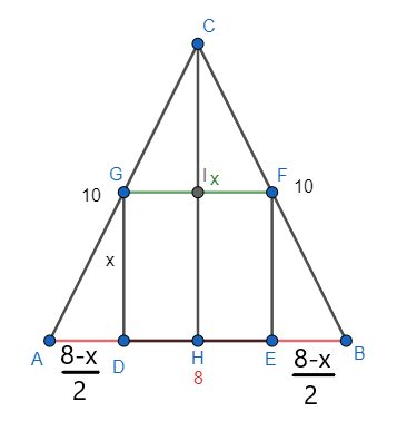 W trójkącie równoramiennym ABC, gdzie długości boków to |AB| = 8 oraz |AC| = |BC| = 10, wpisano kwadrat w taki sposób, że dwa wierzchołki kwadratu leżą na podstawie trójkąta, a dwa pozostałe leżą na jego ramionach. Oblicz długość boku tego kwadratu.