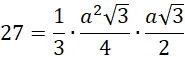 Oblicz długość podstawy korzystają z objętości ostrosłupa. Z twierdzenia Pitagorasa wyznacz wysokość ściany bocznej: