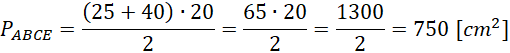 Dłuższa trapezu ABCE, czyli bok AB ma też długość 40 cm. Krótsza podstawa to bok EC o długości 25 cm. Wysokość trapezu, czyli bok BC, ma taką samą długość jak bok AD, czyli 20 cm.