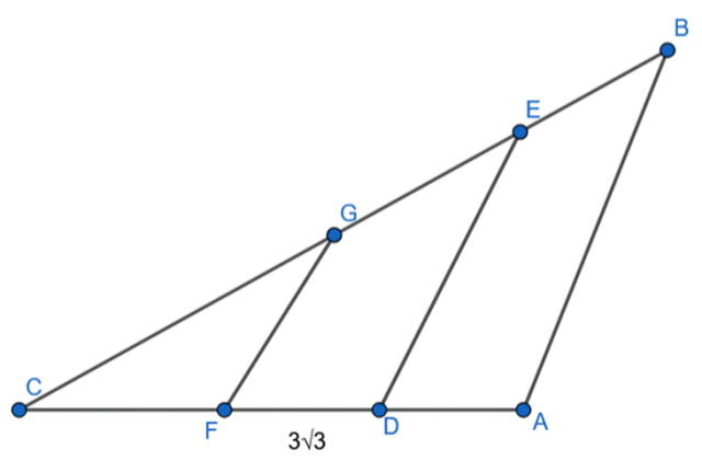 Wyznacz długości odcinków, na które proste podzieliły bok AC, jeśli ma on długość , a w trójkącie ABC poprowadzono dwie proste równoległe do boku AB i podzieliły one trójkąt na trzy figury o równych polach.