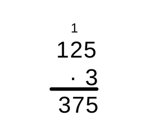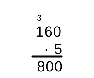 Pomnóż liczbę punktów równą 125 przez 3, ponieważ Kasia zdobyła trzy razy taką liczbę punktów, a następnie pomnóż 160 przez 5, ponieważ Kasia pięć razy zdobyła taką liczbę punktów. Następnie dodaj wyniki do siebie, by dostać, ile punktów zdobyła łącznie Kasia. Wykonując mnożenie pisemne przez liczbę jednocyfrową, należy najpierw pomnożyć liczbę jednocyfrową, przez cyfrę jedności większej liczby. Jeśli otrzymana liczba jest dwucyfrowa, należy cyfrę jedności takiego wyniku zapisać pod słupkiem cyfr jedności, a cyfrę dziesiątek z wyniku trzeba przenieść dalej poprzez dopisanie tej cyfry nad kolejnym w lewo słupkiem, czyli słupkiem cyfr dziesiątek. Przy mnożeniu kolejnego słupka, do wyniku dodaje się przeniesioną cyfrę ze słupka wcześniej. W taki sam sposób należy mnożyć każdą kolejną cyfrę większej z liczb zaczynając od lewej i idąc do prawej. Jeśli w ostatnim słupku wyjdzie liczba większa od 10, to już nie wolno przenosić dalej, bo nie ma kolejnego słupka, lecz należy napisać całą liczbę.