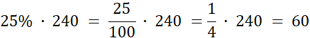 Żeby obliczyć procent z liczby, najpierw zamieniamy procent na ułamek. Procent to ułamek, który w liczniku ma liczbę procent, a w mianowniku liczbę 100. Następnie mnożymy powstały ułamek razy liczbę. 25% z 240 to: