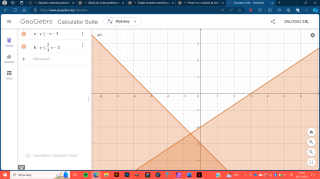 Zapisz nierówność, która opisuje zbiór punktów zaznaczone przez podane proste.